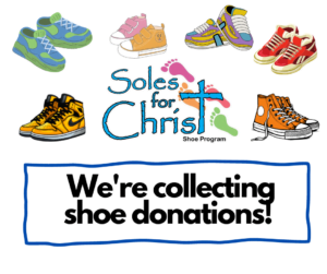 | | We’re very excited to once again collect shoe donations for Soles for Christ this year! Each donated pair will be gifted to a needy child in our community, ensuring they can proudly wear new shoes on their first day of school. We are currently accepting the following new tennis shoes now through August 2nd. - Toddler sizes 5 to 10