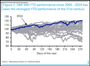 The U.S. economy continues to plow forward, as was noted by Jerome Powell last week in comments he made regarding the underlying strength of the economy. As a result, he took that opportunity to temper expectations for the pace of future interest-rate cuts, which served to reset investor expectations for future policy path and created a profit-taking opportunity heading into the end of 2024 (which has been the strongest year to date since 2000 – see chart of the week below).