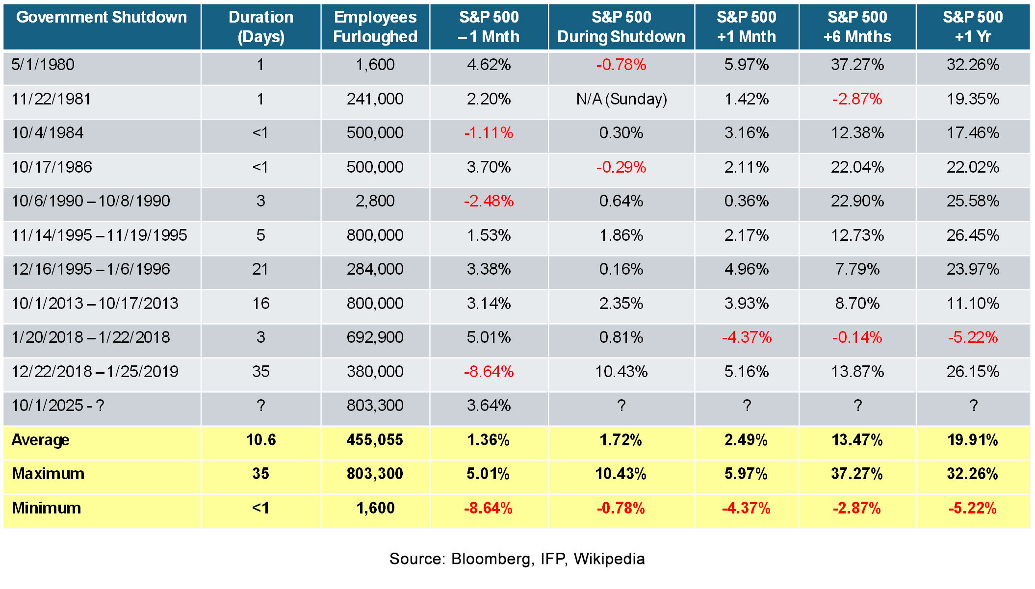 The first government shutdown occurred in May of 1980. Including that instance, the government has shut down 10 other times in the last 45 years, with the current shutdown being number 11. Examining history and data, the equity markets are largely unaffected by shutdowns and (in almost all cases) emerge unscathed, going on to post positive returns six months and one year following their respective shutdowns. (See the chart of the week for historical market performance during government shutdowns.) While history shows government shutdowns have little impact on overall equity markets, there are a few things to consider for the current shutdown. Expectations of further rate cuts are largely priced into the equity markets, with the highest probability of two more 25-basis-point rate cuts before the end of the year. As regularly mentioned by the Federal Reserve, the forward policy path is largely data dependent. With the current shutdown delaying key economic reports related to labor and other areas of the economy, the Fed’s ability to implement policy based on underlying economic conditions becomes very difficult. As a result, additional rate cuts may get pushed out further into the future until economic data resumes. Whether the market will look past this delay is an open question. Related to economic data and policy, one of the catalysts of recent change in Fed commentary has been a softening in the labor market. While the non-farm payrolls and unemployment reports were delayed last week, the ADP report and the JOLTS survey confirmed a “no-hire/no-fire” trend that has been in place for some time. ADP employment came in at -32k, while job openings were higher than expected. Layoff announcements from Challenger Gray & Christmas came in lower as well. A key difference in this shutdown versus previous ones is the talk of laying off government workers as opposed to furloughing. The government has been a key employer in the post-COVID recovery. Accelerated layoffs from the government at a time when the labor market is softening and hiring has been declining for several years may add additional pressure to the softening trend in labor, as those workers would need to be absorbed into the private sector. The labor market has become a focal point for policymakers and the markets in the forward path of policy. These facets of the government shutdown need to be considered in terms of how they play out and how long the shutdown remains in effect. |
